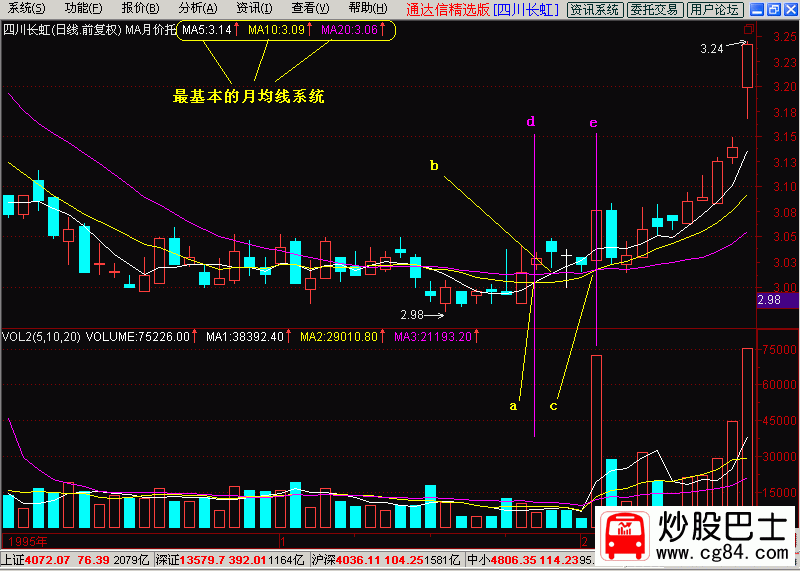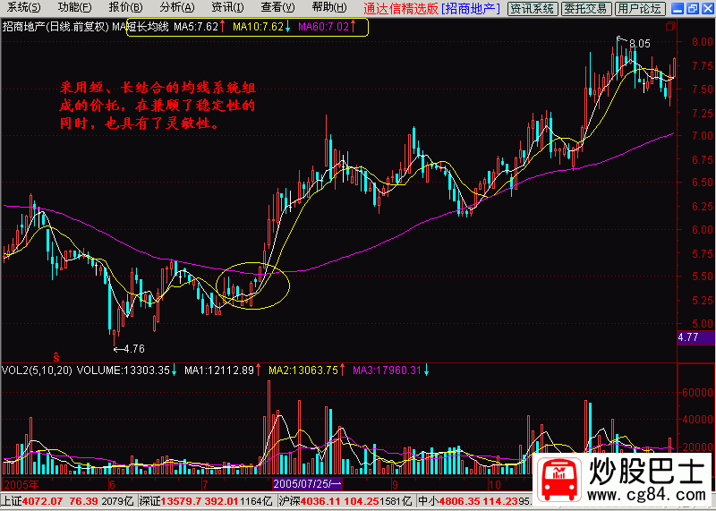 第1节:价托 广通理论里面比较重要的一个基础概念是什么?那就是“价托”!价托又是指的什么呢? 图形特征:请看(图1-1)中,(a线)所指的交叉点是5日均价线从下向上穿越10日均价线所形成的结点;(b线)所指的交叉点是5日均价线从下向上穿越20日均价线所形成的结点;(c线)所指的交叉点是10日均价线从下向上穿越20日均价线所形成的结点;由这三个结点组成一个封闭的三角形,这个三角形就称为“价托“ 图1-1 市场意义: 当20日均价线在最上方,10日均价线在中间,5日均价线在最下方时,称为“空头排列”,(图1-1)中(d线段)以前的均线就是空头排列,只要均线是空头排列,那么就没有形成价托的可能,一个没有形成价托的股票,那么它的下跌行情就还没有结束!