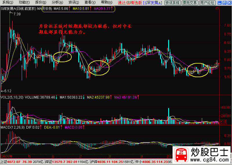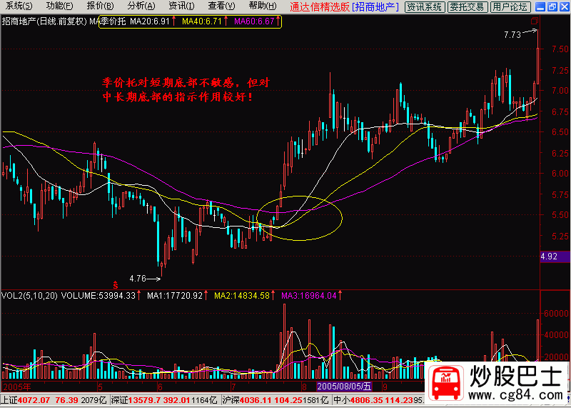 只有当股价长期下跌,跌无可跌后,此时空方抛压减轻,多方开始试探性的进场,从而推动股价缓慢回升,随着股价的回升,5日均价线在下跌以来第一次上穿了10日均价线,这说明5日内买入的人愿意用超过10日内的平均价格去追涨,该股的短期需求大于了供给,在盈利示范效应的带动下,又有一批股民进场买入,捂住就能多赚又鼓励持股者继续持股,形势朝有利于多方的方向发展!不久5日均线上穿20日均线,使20日内买进的股票也有盈利,此消息继续鼓动人们买进该股,鼓励持股者继续持股,该股的需求量急增,而供给量却越来越小,终于有一天,10日均线上穿了20日均线,最终三条均线封闭成一个三角形托,这使盈利的人扩展到5日持股者、10日持股者、20日持股者,这种循环继续强化的话,三条均线将向上形成多头排列(图1-1)中(e线段)以后的均线就是多头排列,从而展开一轮多头行情! 三角形“托”在底部形态中是否有普遍性,考证后发现绝大多数个股都有这个规律,而在长期下跌的末端,这种三角形托几乎成了底部的代名词。 1:月价托(由5日、10日、20日均价线组成),该组合较为敏感,对中长期底部的提示作用较弱,对阶段性短期底部的提示有一定的参考作用;见(图1-2) 图1-2 图1-3 图1-4 4:超短期均线价托(由5、10、20单位均线组合而成),一般是指用在15分钟、30分钟、60分钟等K线周期上的均线系统,该系统一般用来对被怀疑的股价底部区间进行微观分析,以指导对个股进行精确的瞄准;